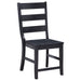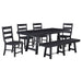 This six-piece dining set turns your everyday surroundings into a casual mix of farmhouse and industrial charm. Standing out with a bold black finish over wood construction, this set features both clean lines and stylish curving, striking a perfect balance. A sawhorse silhouette creates symmetry in a table. It showcases a true square edge top, angled open-design legs, and charming metal brace accents. Dramatic ladderback chairs feature a shapely, extra tall back, as straight seats offer scooping to embellish your comfort level, and a dining bench matches the table’s sawhorse profile.