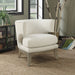 This thick-cushioned accent armchair is a highlight of any room. Featuring a barrel back and high armrests, it conveys a regal look. Its stylish appeal comes from nailhead trim along the frame and cutout design on the side. Slightly flared legs feature a weathered grey finish. Upholstered in brilliant white chenille that matches any contemporary decor.