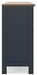 - Two-tone finish features a dark slate blue with light brown wood-tone top