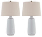 This table lamp set sends out a lovely glow, enhancing minimalist interior spaces. The conical white ceramic base with subtle texture and drum hardback fabric shade create a modern aesthetic. Place these accent lamps on a console table for a serene hint of color and understated chic sophistication.