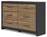 - Dresser with two-tone finish (matte black finish; rich honey brown finish over replicated walnut grain with authentic touch)