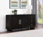 A pair of doors and three drawers create abundant storage in a modern sideboard. Designed for functionality and style, it boasts a clean-lined silhouette complete with rounded corners that soften its overall presentation. Underneath, angled legs add visual interest and depth, perfect for a dining room or even your entryway. A dark brown finish complements acacia veneer, offering the organic elegance of wood grain details. Contrasting silver-toned hardware includes bold door pulls and round knobs, offering a polished finishing touch.