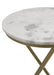 Topped with a solid white marble, this contemporary accent table offers up classical elements with modern silhouettes and shapes. situated on a flush ringlet base is a frame with an angled and straight metal support structure. The elegant, eye-catching base also features a warm, antique gold finish that lends a traditional flair. Perfectly suited nestled beside an accent chair or doubling as a nightstand in a compact bedroom space, this accent table can support books, refreshments or a potted plant for a hint of greenery. Versatile as it is stylish, this round accent table offers soft lines and an effortlessly understated timeless look.