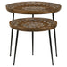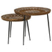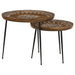 Place this boho nesting table set in a global-inspired room for a hint of warmth. Tray-like round tables with softly raised edges boasts a charming hand-painted motif in a bright white hue. Each table in this set rests on three tapered legs for a slender, open look. Sustainably designed, each round tabletop is carved from eco-friendly solid mango wood. The flared black legs also offer an industrial touch to a space.