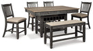 Set your sights on this counter-height dining table set. This high-profile table beautifully suits your storage needs—base includes two open shelves, four drawers and a built-in wine rack. Heavily textured black and oak finish is trend-right urban farmhouse style. Set includes six upholstered bar stools with tapered legs for a winning combination.
