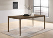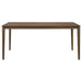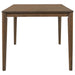 A sleek silhouette makes this wooden dining table a perfect choice for anyone who prefers a minimalist decor style. Slim, tapered legs support an expansive, rectangular tabletop to create a design that exudes simple glamour. A lightly beveled top with clipped corners adds just the right touch of understated style. A rich, medium walnut finish allows this beautiful piece to warm up a room. Crafted of Asian hardwood, this transitional dining table is exceptionally durable and built for lasting use.