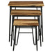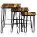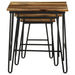 This rustic industrial style nesting table ensemble offers three tables that stack together for a compact design. Built with sheesham wood tabletop surfaces, this versatile and charming nesting table set offers a warm, natural look to a space. Each rectangular tabletop rests on a black iron frame with mid-century-inspired hairpin style legs and side braces for extra support. The retro touches and natural elements come together, making a stunning addition in a mountainside cabin or lakefront retreat. Stack them when you need to make floor space or slide each out when entertaining family and guests.