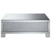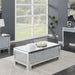 This solidly-constructed silver coffee table fits beautifully in a contemporary living room. Its straight lines show a fresh, clean ambiance. Short block legs convey sturdiness and stability. Sides have a unique pattern that goes well with the silver of the table top and legs. A silver accented vase matches well with the table for a custom look that's sure to please.