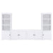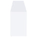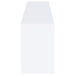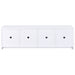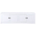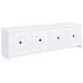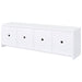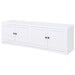 Create plenty of storage to accompany your large screen television with this modern TV stand. Designed to host a TV up to 80 inches, it's a long, linear structure with clean, precise lines that blend into most spaces. Its neutral finish complements melamine surfaces that add durability, perfect for a family living space. Four doors open to reveal interior shelving that's adjustable and includes cord management openings for easy organization of media and gaming components. Use the added shelving for accessories and media in your tidy, organized space.