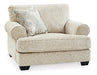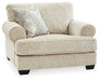 This oversized chair and ottoman strike a beautiful balance between classic and current. The oversized chair’s traditional elements include t-cushion seating and setback roll arms, angled for modern flair. Jacquard paisley pillows make a muted, mellow complement to the chair’s casual textured chenille upholstery. Choice of sandstone beige is a light and lovely style awakening.