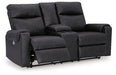 You don’t just want to recline. You want to recline in high design. This power reclining loveseat’s clean lines and supple faux leather are out to capture your heart with style and comfort. Easily tuck away remotes or gaming controllers and keep drinks close by with its handy console. This loveseat gives you the upscale look you want for less—simply take a seat, raise your legs and relax.