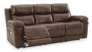 When you curl up in this power reclining sofa with adjustable headrest, you won't want to get up. Its combination leather and faux leather upholstery comes in a neutral brown chocolate hue that pairs up comfortably with most color schemes. This cozy sofa will be your go-to spot for watching TV, reading, or just closing your eyes and drifting off to sleep. Perfectly positioned cushions and overstuffed pillow top arms allow unparalleled relaxation. With a look that turns heads, this reclining sofa has an extended ottoman to enhance comfort, and an adjustable headrest for a primo view of the TV even when you're fully reclined.