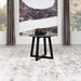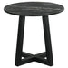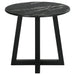 Gracefully poised, the round end table is a modern muse clad in black faux marble, a high-pressure laminate that promises enduring strength and effortless care. This exquisite tabletop, impervious to the whims of daily life, offers the opulent look of marble without its demanding nature, making luxury more accessible and relaxed. Resting on a solid wood base, the table's silhouette is a celebration of stability and elegance, with angular legs that create an intriguing visual dialogue with the smooth curves above. It's a versatile piece that elevates the art of living, turning the simple act of placing down a book or a drink into a moment of understated sophistication.