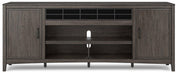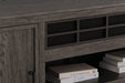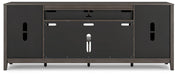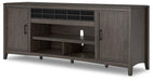Bring a touch of warmth and beautiful ambiance to your living room. Cool and clean, yet warm and inviting. This TV stand with fireplace insert has so many standout qualities, making it an inspired choice for your dream decor. A prime example of “casual contemporary” style at its very best, the designer piece is dressed to impress in a medium gray-brown finish with a blackened wood grain contrast. Spacious cabinets and shelves are ideal for storing items like your e-reader, TV remotes and other entertainment must-haves. The decorative grille on the upper shelf can conceal a soundbar for a sleek look.