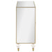 Polished materials and luxe accents combine to create this stunning, glam accent cabinet. Covered almost entirely in mirror surfaces, this accent cabinet boasts a latticed design in the dual cabinet doors, inset with a champagne diamond pattern. The shimmering champagne finish carries through in the borders, traditional teardrop pendant hardware and capped feet. Store personal effects inside, organized on the two shelves. Supported by elegantly turned acrylic legs that offer a transparent look, this accent chest exudes a regal, refined aesthetic.
