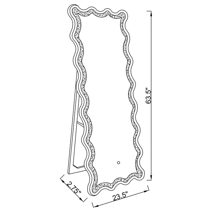 Introduce modern glam sophistication to your bedroom or living area with a contemporary LED floor mirror. It includes a frame that allows it to stand on its own, creating the option for placement anywhere in your space. The mirror boasts a dynamic frame design, with a wavy silhouette created with convex and concave curves that introduce a flowing, engaging ambiance. Mirror and diamond-like trim layers create sparkle and sophistication, perfect for a modern glam bedroom setting. The mirror includes an LED light, perfect for illuminating your daily wardrobe choices in a master suite.