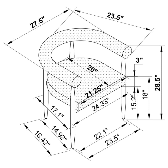 Reimagine your dining room with the fresh, elegant character of a five-piece modern dining set. Centered on a round table with a faux black marble tabletop, the set offers compelling contrast and dimension in a kitchen or dining room. The tabletop is printed black melamine, designed to provide seamless character at an affordable price point. The base of the table is a star pedestal crafted in hammered black metal, offering artistic flair to your space. Four side chairs complete the set, pairing black hammered legs with plush cream upholstery with charming texture and plush cushioning.