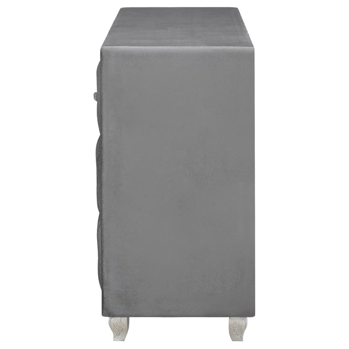 Lush and luxurious, this dresser makes a stunning statement. Its gorgeous, metallic grey finish boasts a soft texture and a subtle sheen. Elegant tufting adorns its drawers for a touch of updated style. Round, crystal-like drawer handles complete its look with a lovely hint of sparkle. Topped with a gorgeous matching mirror, this dresser is simply magnificent.