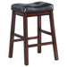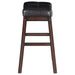 Simple and stylish, this contemporary counter stool is perfect for a kitchen island or home bar. A curved saddle-style seat offers optimal comfort with plush cushioning. Tufting adds dimensionality to a backless and armless silhouette. Black leatherette upholstery is always stylish, and is easy to care for. Angled legs are crafted in wood and feature a rich cappuccino finish, while built-in footrests offer easy relaxation.