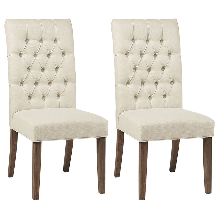 This set of two wood and fabric tufted parson chairs has a handsome rustic design. Each chair is crafted with durable Asian hardwood and plywood. Stylish elements shine through in the sand-colored linen-like fabric upholstery and tufted seat back. A warm vineyard oak finish completes the look of this charming set. You'll love the versatility that makes these chairs well suited for both everyday or formal dining.